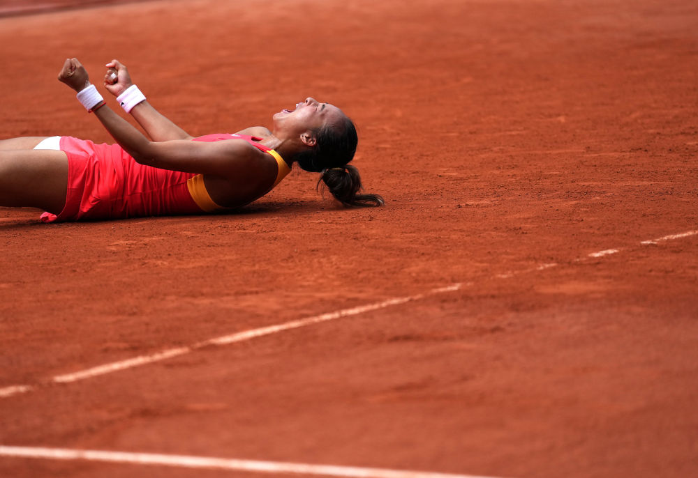 中國選手鄭欽文慶祝勝利。新華社記者 萬象 攝
