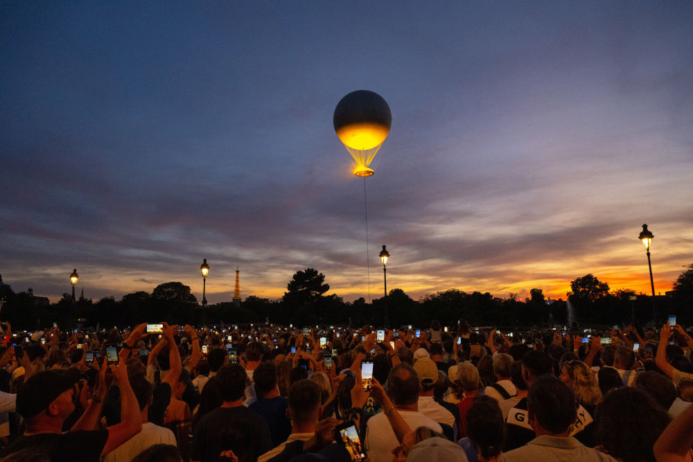 歷史建筑與現(xiàn)代藝術(shù)的融合彰顯法式浪漫。埃菲爾鐵塔上的燈光秀劃破夜空。特羅卡德羅廣場上,神秘人將火炬交給法國傳奇球星齊達內(nèi),不久后,杜樂麗花園內(nèi)的主火炬——一個直徑7米的火焰環(huán),頂部是一個高30米、直徑22米的系留氣球,被“點燃”。