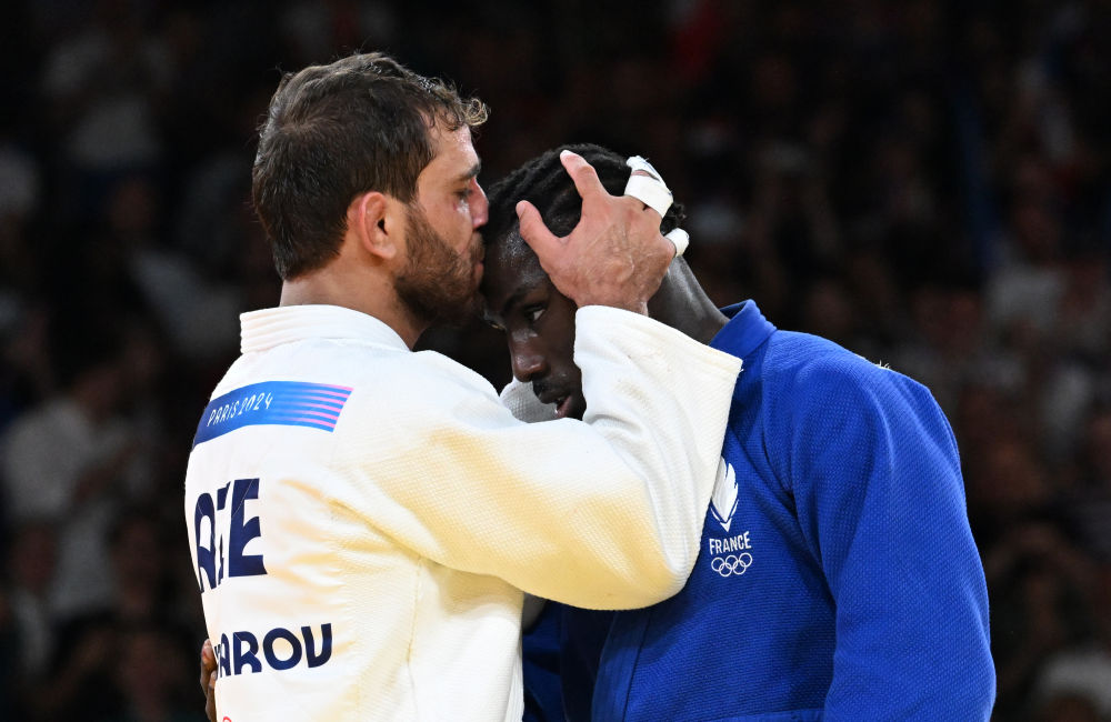 精疲力盡的兩人在賽后緊緊相擁,贏得金牌的海達羅夫親吻了本杰明的額頭,表示敬意。