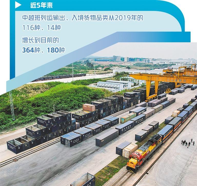 數(shù)據(jù)表明,高效、實惠、便捷的中越班列已得到市場認(rèn)可。近5年來,中越班列運輸出、入境貨物品類從2019年的116種、14種,增長到目前的364種、180種。中越班列集貨地已覆蓋廣西及周邊省份20多個地市,跨境貨物運輸覆蓋越南、老撾、泰國等多個東盟國家。