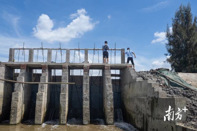 楊健宏與李明霖爬上水閘,查看紅樹(shù)林復(fù)種情況。