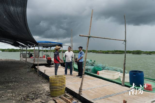 暴雨前夕,楊健宏正與保護(hù)區(qū)管理局工作人員向魚(yú)塘主科普紅樹(shù)林保護(hù)知識(shí)。
