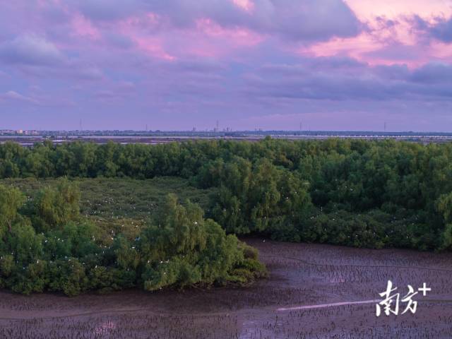 傍晚,晚霞鋪滿(mǎn)天空,一群群鷺鳥(niǎo)飛回紅樹(shù)林過(guò)夜。