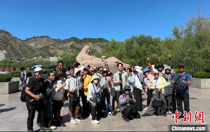 8月18日,臺(tái)胞在黃河母親雕塑前合影。王牧雨 攝