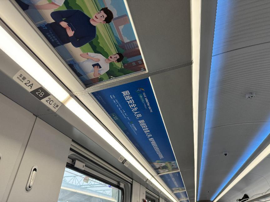 據(jù)介紹,專列的8個主題車廂分別以“中國網絡法治三十年”“網絡安全”“數(shù)據(jù)安全”“未成年人網絡保護”“數(shù)據(jù)出境之旅”“反網暴凈網行動”“個人信息守護”以及“網絡空間命運共同體”命名,通過鏡框海報、玻璃貼、小桌板貼、行李架彩貼、頭枕片、車內LED信息屏等形式多樣的載體,全面展示網絡法治30年成就、網絡空間命運共同體主張。讓乘客們在享受舒適旅途的同時,也能輕松學習到實用的法律信息。