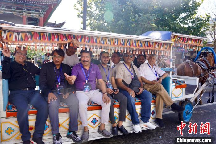22日,巴基斯坦媒體人乘坐街區(qū)特色的電驅動馬車,參觀游覽民族風情街。陳欣怡 攝