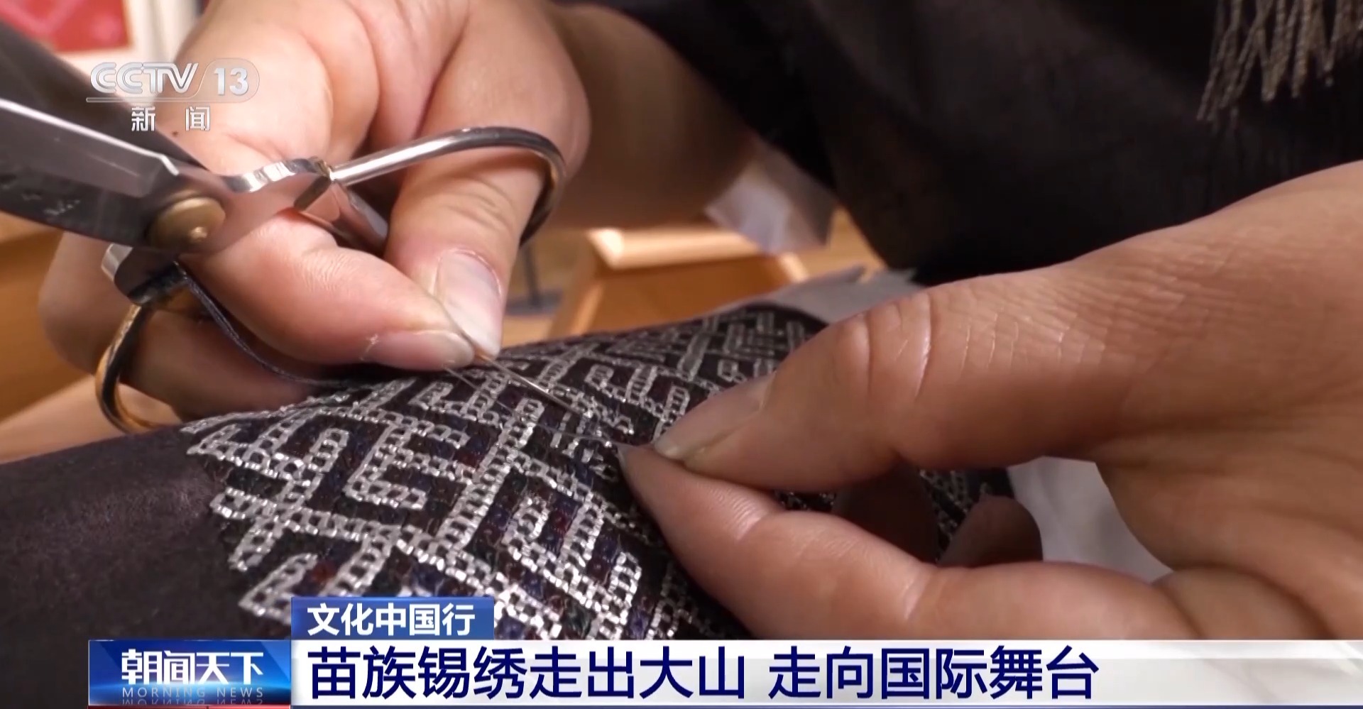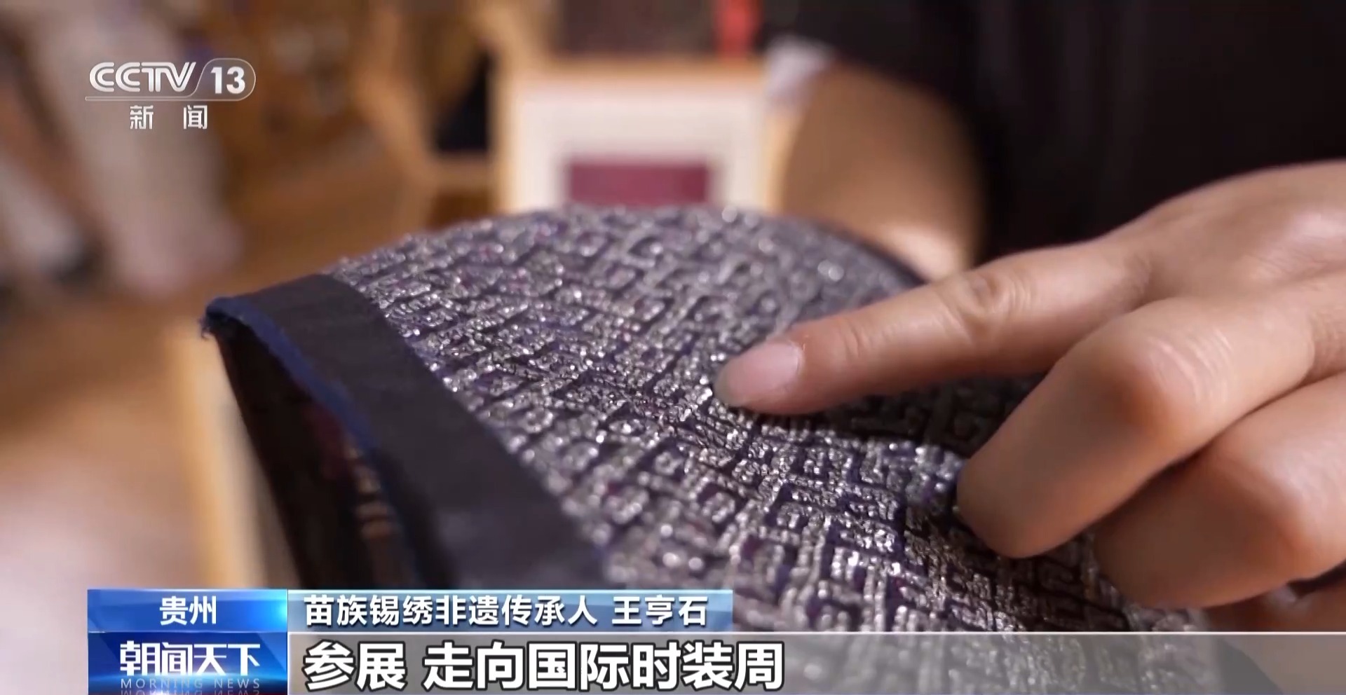 苗族錫繡非遺傳承人 王亨石:按照他要尺寸的大小自己繡出來,繡出來以后寄給他,他自己再設(shè)計(jì)出作品,參展,走向國際時(shí)裝周。我想生在大山里面幾百年的錫繡,今天能走上這么高的國際舞臺(tái),我真的感到很高興而且很自豪。