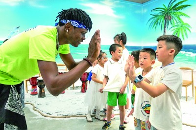 在位于湖南高橋大市場的中非經(jīng)貿(mào)博覽會常設展館安哥拉館,志愿者和學生在研學過程中擊掌。新華社發(fā)