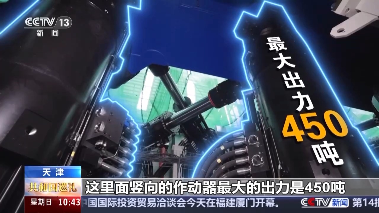 天津大學(xué)國家大型地震工程模擬研究設(shè)施科學(xué)工藝部部長 劉銘劼:我們這個場地高度有31米,跨度有43米,這部分區(qū)域的長度是120米。我們這個振動臺臺面尺寸20米乘16米,最大載重1350噸,大概是二十多輛重載卡車的重量。我們在滿載情況下可以運(yùn)行的最大加速度是2.0個重力加速度。這么大的加速度實際上已經(jīng)超過了我們9度烈度條件下的地震動的水平。