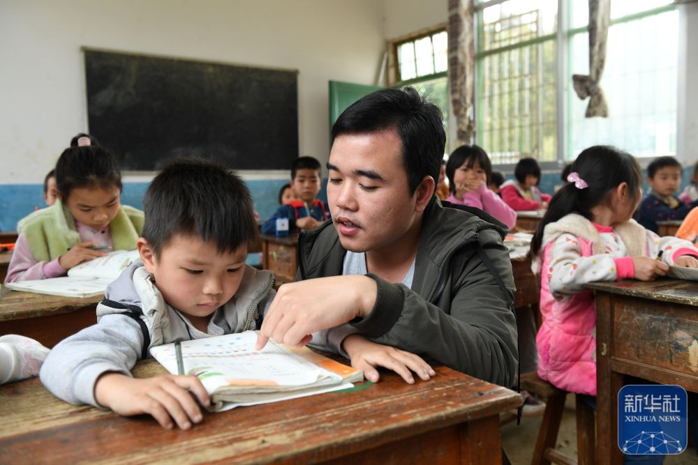 在廣西富川瑤族自治縣新華鄉(xiāng)湖廣小學(xué),“90后”老師謝其鶴在輔導(dǎo)學(xué)生功課(2019年3月20日攝)。