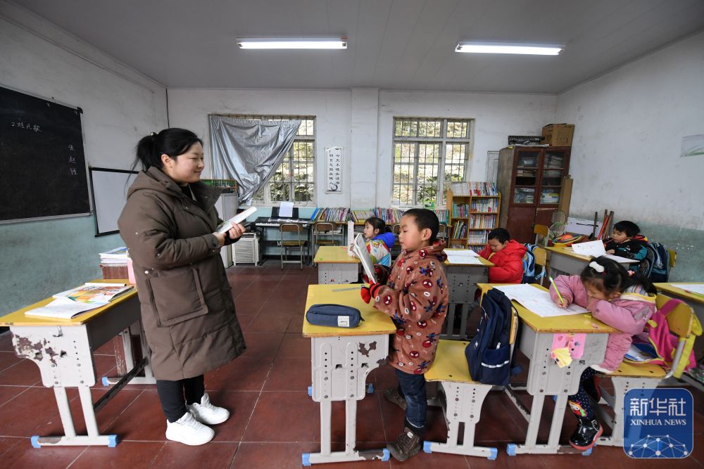 在廣西靈川縣蘭田瑤族鄉(xiāng)東良教學(xué)點,“85后”老師石夏月給學(xué)生上課(2022年2月24日攝)。