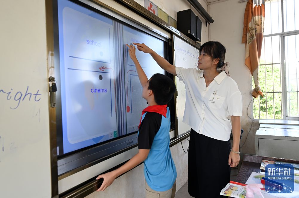 在廣西南寧市邕寧區(qū)中和鎮(zhèn)中心學(xué)校周祿教學(xué)點,“90后”老師何海香指導(dǎo)學(xué)生完成課堂作業(yè)(2024年9月4日攝)。