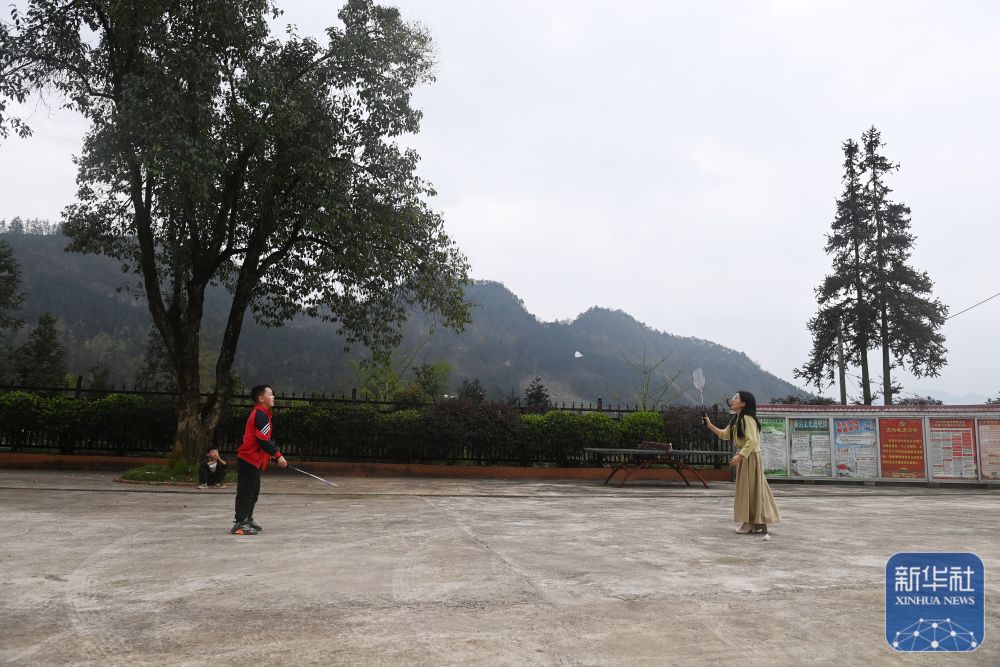 在廣西灌陽縣洞井瑤族鄉(xiāng)野豬殿小學(xué),“95后”老師趙艷和學(xué)生打羽毛球(2024年3月27日攝)。