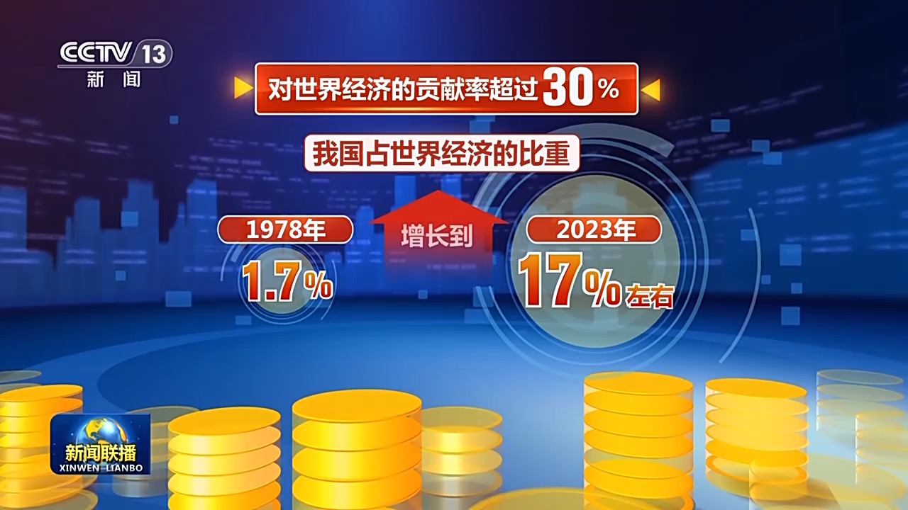 我國占世界經(jīng)濟的比重,從有數(shù)據(jù)統(tǒng)計以來的1978年的1.7%,增長到2023年的17%左右,對世界經(jīng)濟的貢獻率超過30%。