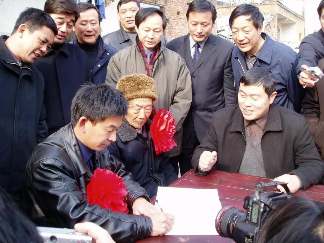 2005年1月5日,丹江口市三官殿辦事處馬灣村村民王瑞權(quán)(左一)與辦事處負(fù)責(zé)人簽訂搬遷合同,成為南水北調(diào)中線(xiàn)工程移民搬遷第一戶(hù)。(湖北日?qǐng)?bào)通訊員 陳華平 攝)