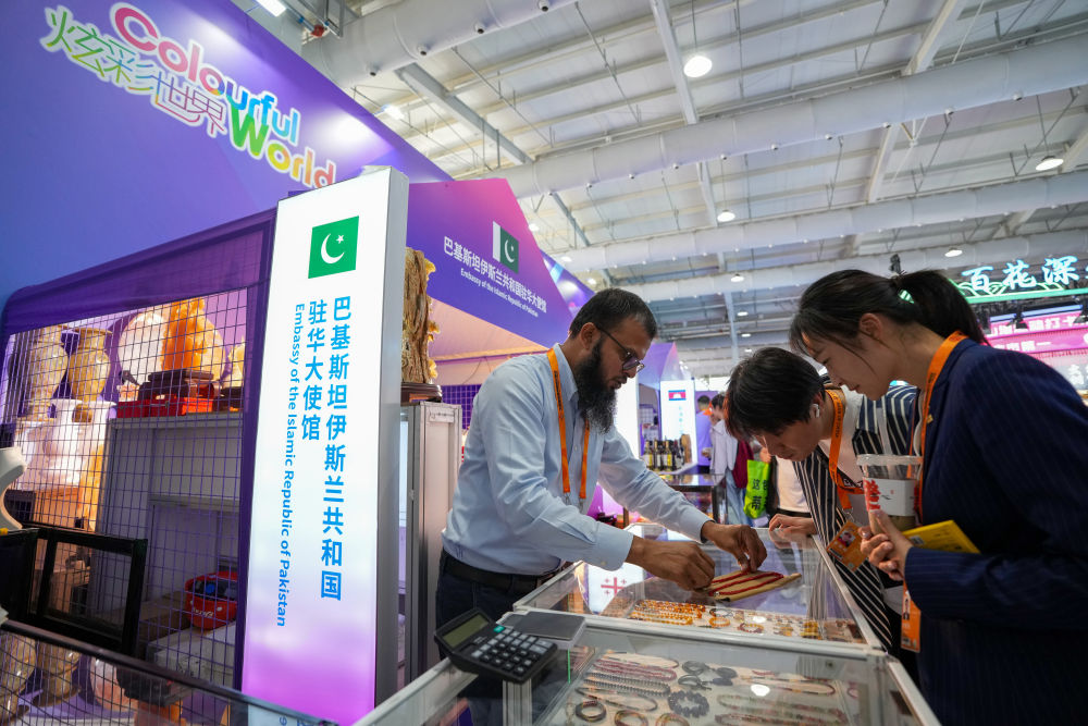9月12日,在服貿(mào)會首鋼園區(qū)的炫彩世界——‘一帶一路’沿線國家特色文化展示活動上,參觀者在巴基斯坦伊斯蘭共和國駐華大使館展區(qū)選購商品。新華社記者 鞠煥宗 攝