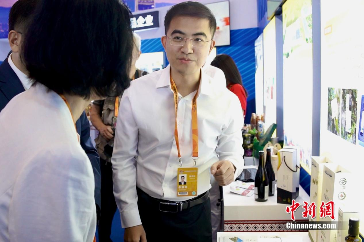 臺(tái)灣青年林書任推薦他從大涼山帶來(lái)的橄欖油。陳銀沙 攝