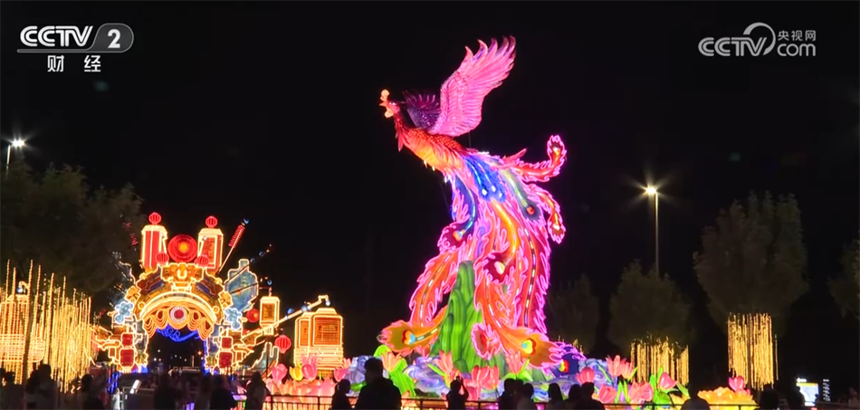 現(xiàn)場展出的彩燈有著“高、大、新、奇、特”等特點(diǎn),其中,大型燈組迎賓門長約80米,單個燈籠最大直徑就達(dá)15米;還有采用“彩色吹塑紙+透明亞克力”材質(zhì)的“鳳舞九天”燈組,這只“鳳凰”全身共有4萬片羽毛,每一片羽毛都由工匠手工剪制而成,燈組總剪制量就高達(dá)800萬剪。