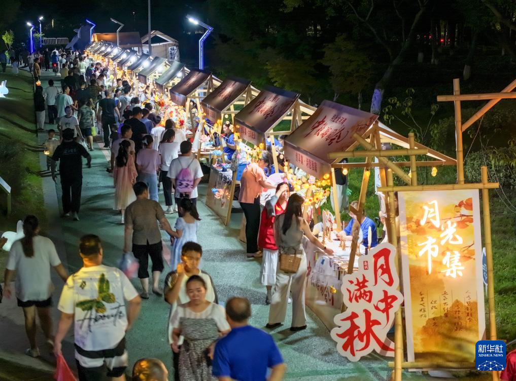 9月15日,游客在江蘇省泰興市龍河灣公園逛“月光市集”(無人機照片)。