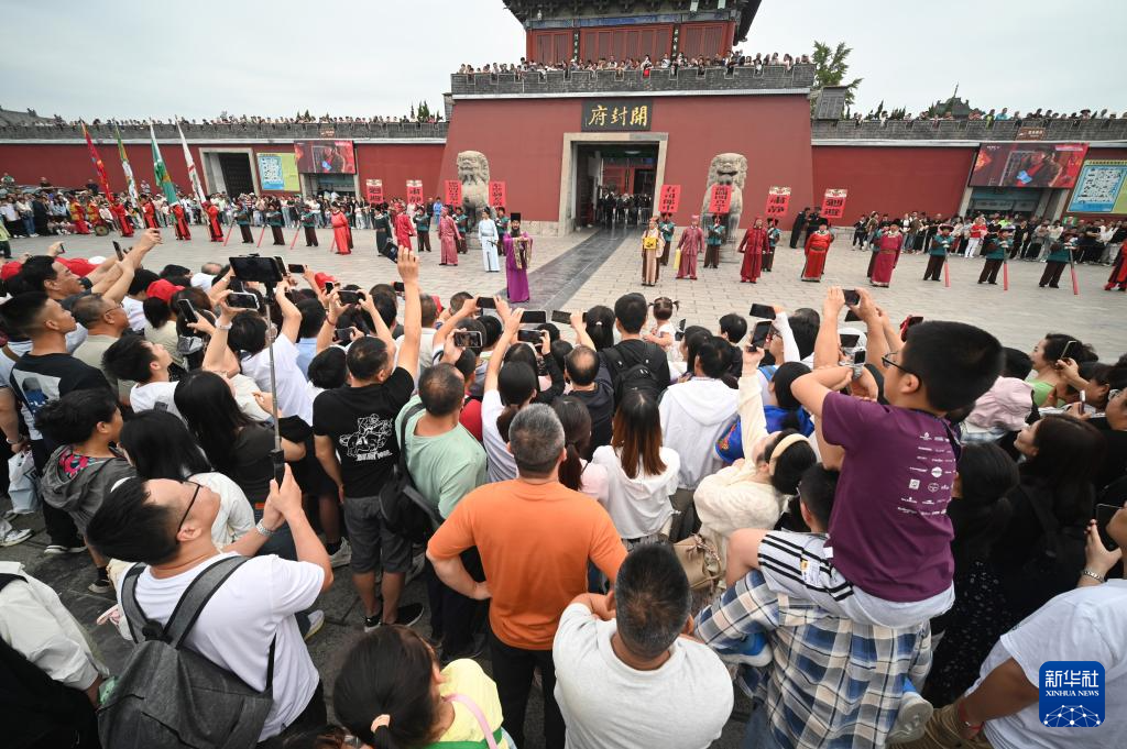 9月16日,游客在河南省開封市開封府門前觀看《開衙迎賓》儀式。