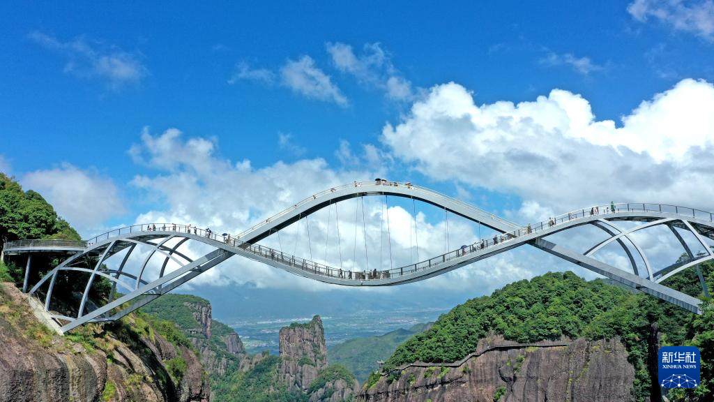 9月17日,游客在浙江省臺州市仙居縣神仙居景區(qū)如意橋上游玩(無人機照片)。