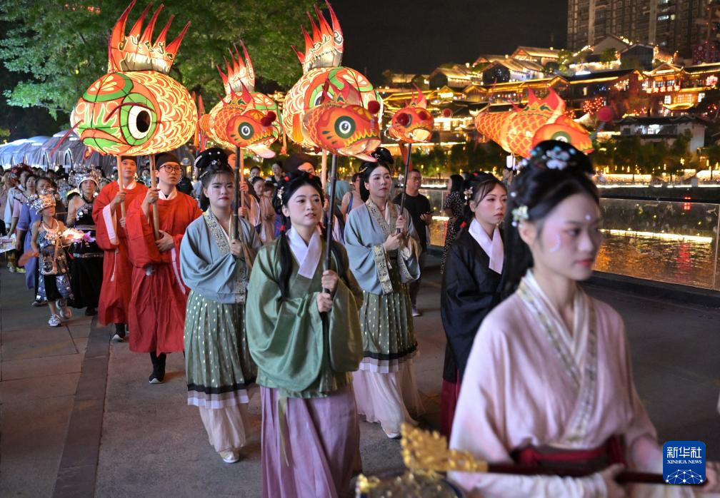 9月16日晚,在湖北省宣恩縣城貢水河畔,人們身著傳統(tǒng)服飾參加巡游活動。