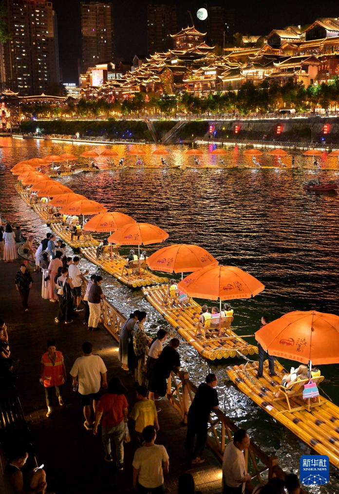 9月17日晚,游客在湖北省宣恩縣城貢水河中乘坐竹筏賞夜景。