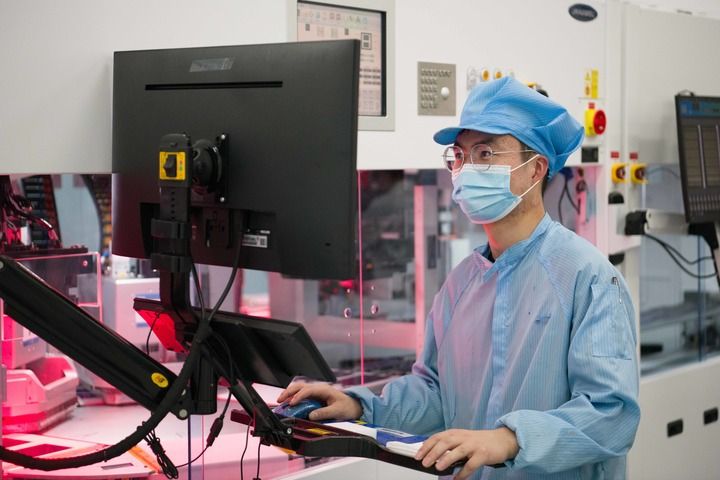 8月20日,在安徽華晟新能源科技股份有限公司的異質(zhì)結(jié)光伏電池及組件工廠內(nèi),工作人員在查看智能化產(chǎn)線運(yùn)行情況。