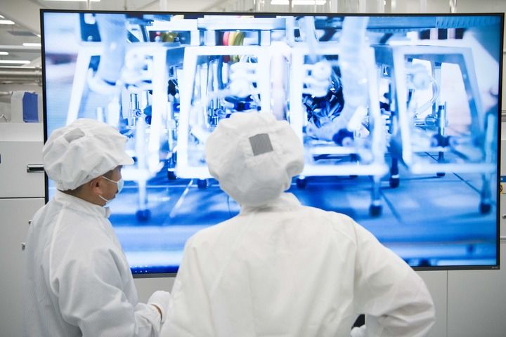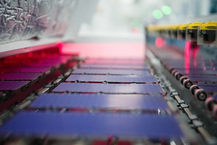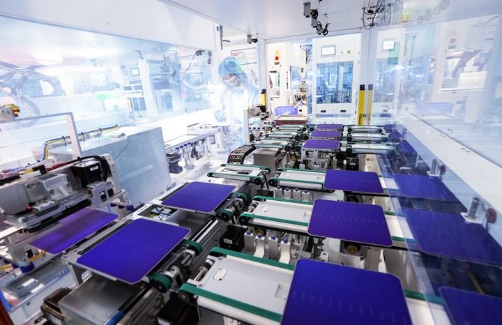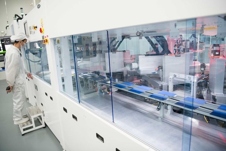 安徽合肥,全球單體產(chǎn)能最大的異質(zhì)結(jié)光伏電池及組件一體化工廠,工業(yè)機(jī)器人將一個(gè)個(gè)硅片投送到一架白色機(jī)器的腔體,經(jīng)過綿延的智能化流水線,狀如手機(jī)大小、薄如紙片的光伏電池片便下線了。