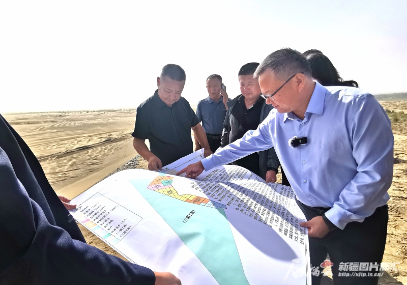 9月5日,民豐縣領(lǐng)導(dǎo)在治沙現(xiàn)場為記者介紹后河壩防沙治沙規(guī)劃。石榴云/新疆日報記者 曹華攝