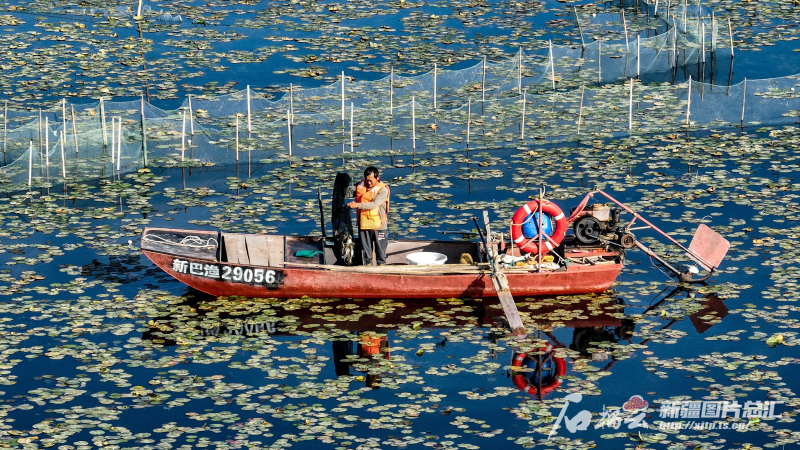 9月20日,養(yǎng)殖戶在博斯騰湖上捕撈螃蟹(無人機(jī)攝)。石榴云/新疆日報(bào)記者 周鵬攝