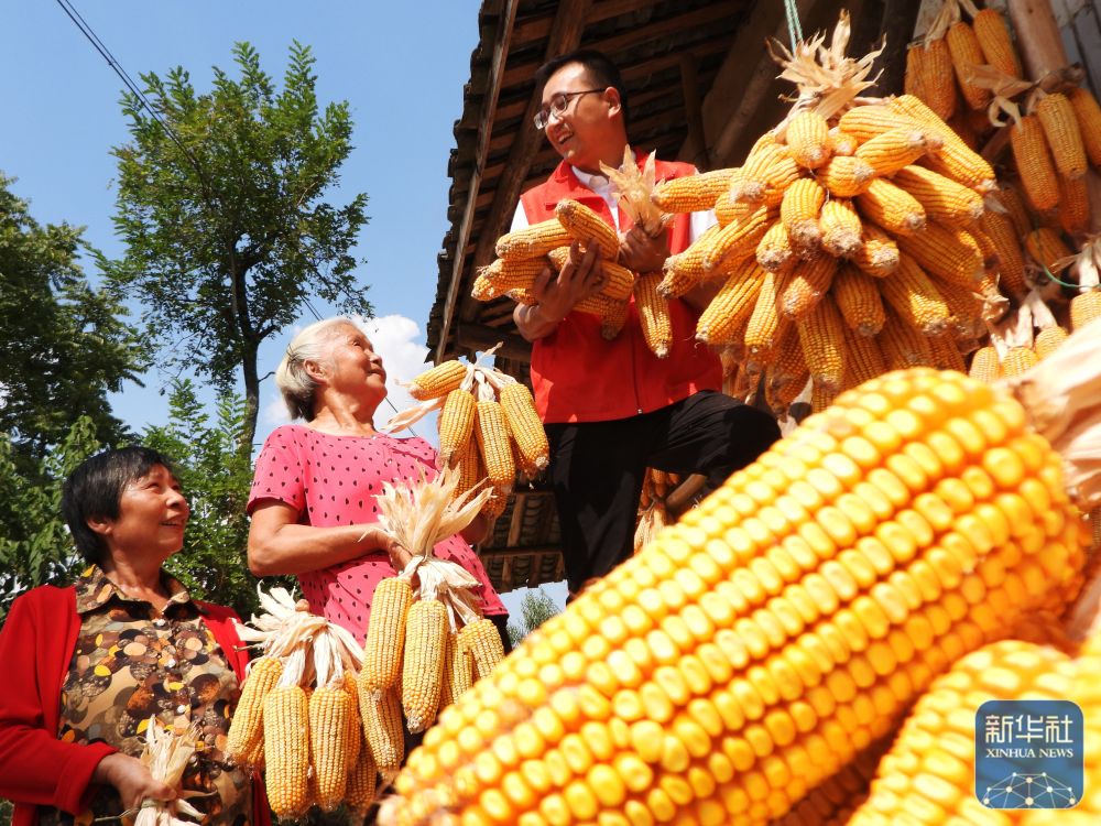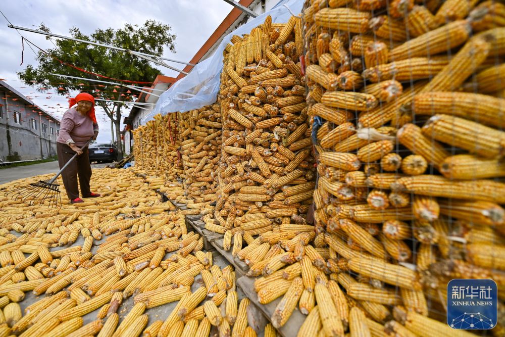 9月22日,在四川省達(dá)州市大竹縣朝陽鄉(xiāng)木魚村,駐村工作隊(duì)員和村民在晾曬收獲的玉米。