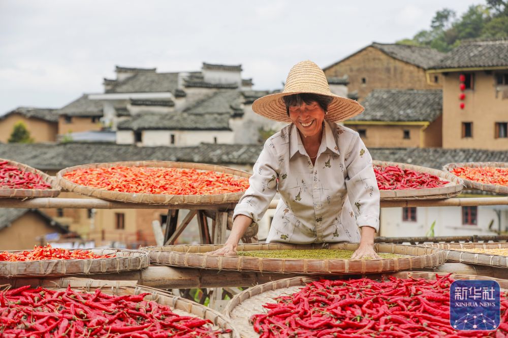 9月22日,在安徽省黃山市歙縣陽產(chǎn)村,村民在土樓前晾曬農(nóng)作物。