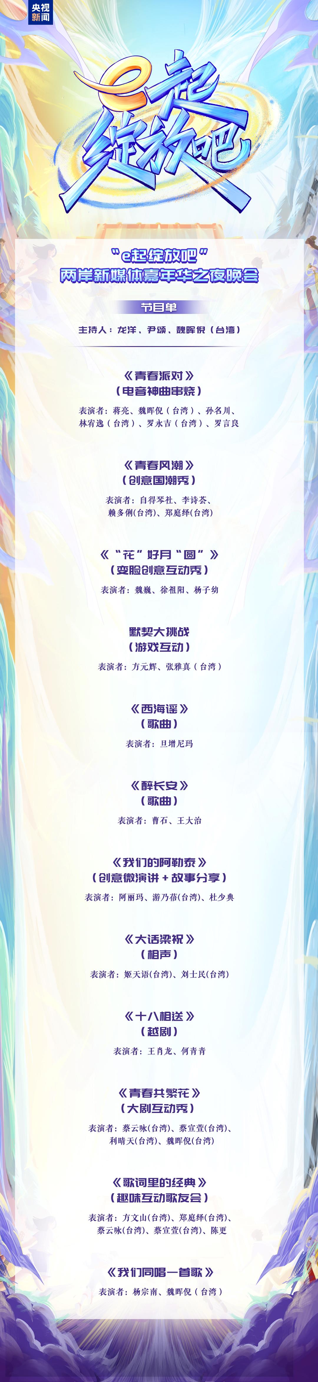“e起綻放吧”兩岸新媒體嘉年華之夜晚會(huì)今晚(9月25日)20時(shí)將在看臺(tái)海、大灣區(qū)之聲、央視頻、央視新聞、央視財(cái)經(jīng)等平臺(tái)播出。來(lái)自兩岸的文化名人、網(wǎng)紅博主、青年代表以“才藝+故事”的融合表現(xiàn)形式,結(jié)合影視劇、國(guó)潮音樂(lè)、舞蹈、詩(shī)詞歌賦、旅游美食等文化元素,共尋文化記憶、共話青春故事、共融民族情感,共享一場(chǎng)心手相牽的青春盛宴。兩岸年輕人在晚會(huì)中同唱一首歌、同追一部劇、同創(chuàng)一首詩(shī),展現(xiàn)兩岸交流交往、融合發(fā)展中的蓬勃青春力量。