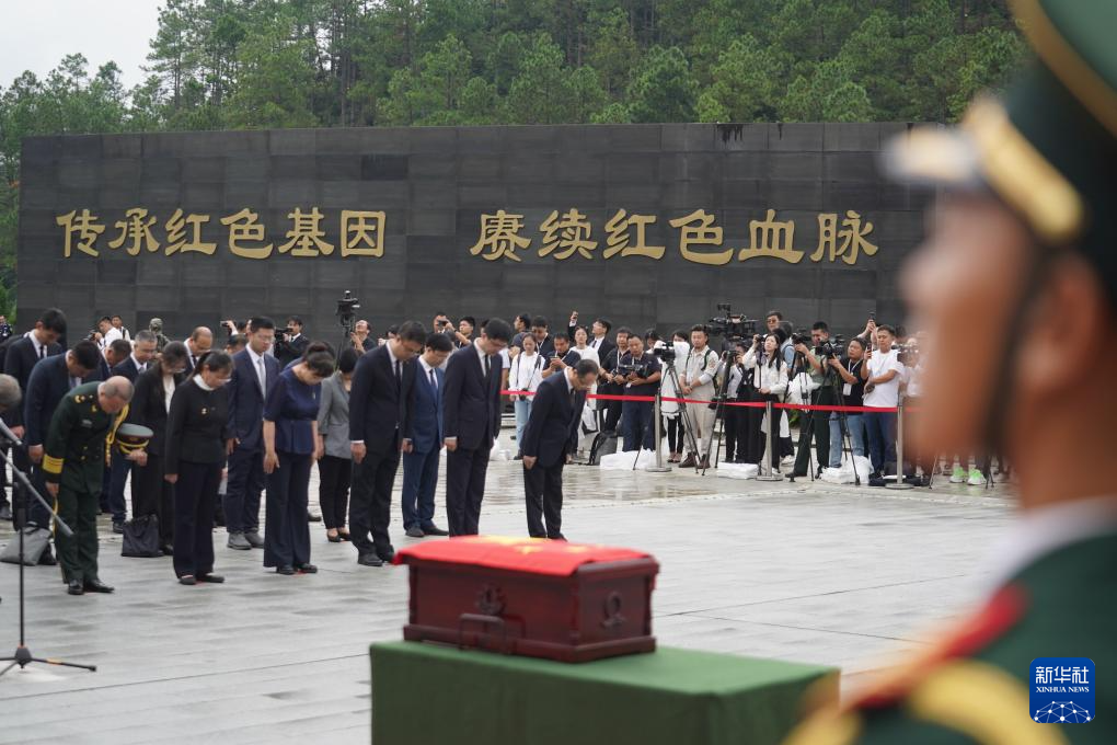 隨著《思念曲》響起,在2名禮兵持槍護衛(wèi)下,2名禮兵護送黃公略烈士棺槨緩緩步入現(xiàn)場。全場奏唱中華人民共和國國歌。全體人員脫帽肅立,向烈士默哀。18名禮兵鳴槍3響,向烈士致敬。