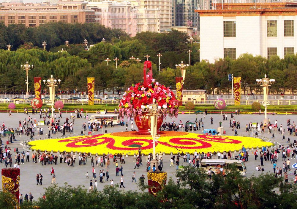 圖為9月25日拍攝的天安門廣場(chǎng)“祝福祖國(guó)”巨型花籃。新華社記者 鞠煥宗 攝