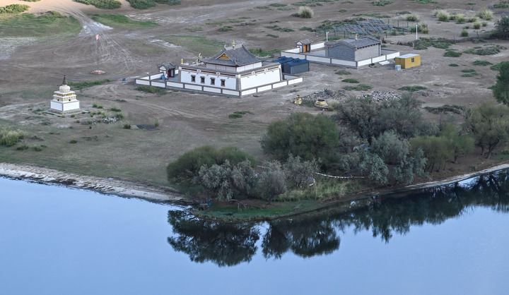 驅(qū)車深入巴丹吉林沙漠,翻過(guò)數(shù)不盡的沙丘,來(lái)到水草豐美的廟海子。這里四面環(huán)沙山,一座200多年前的白墻金頂寺廟坐落在湖邊,為雄渾壯闊的自然景象抹上一筆濃厚人文氣息。觀者無(wú)不感嘆,當(dāng)年交通不便,如何在沙漠腹地建成如此精美的建筑。
