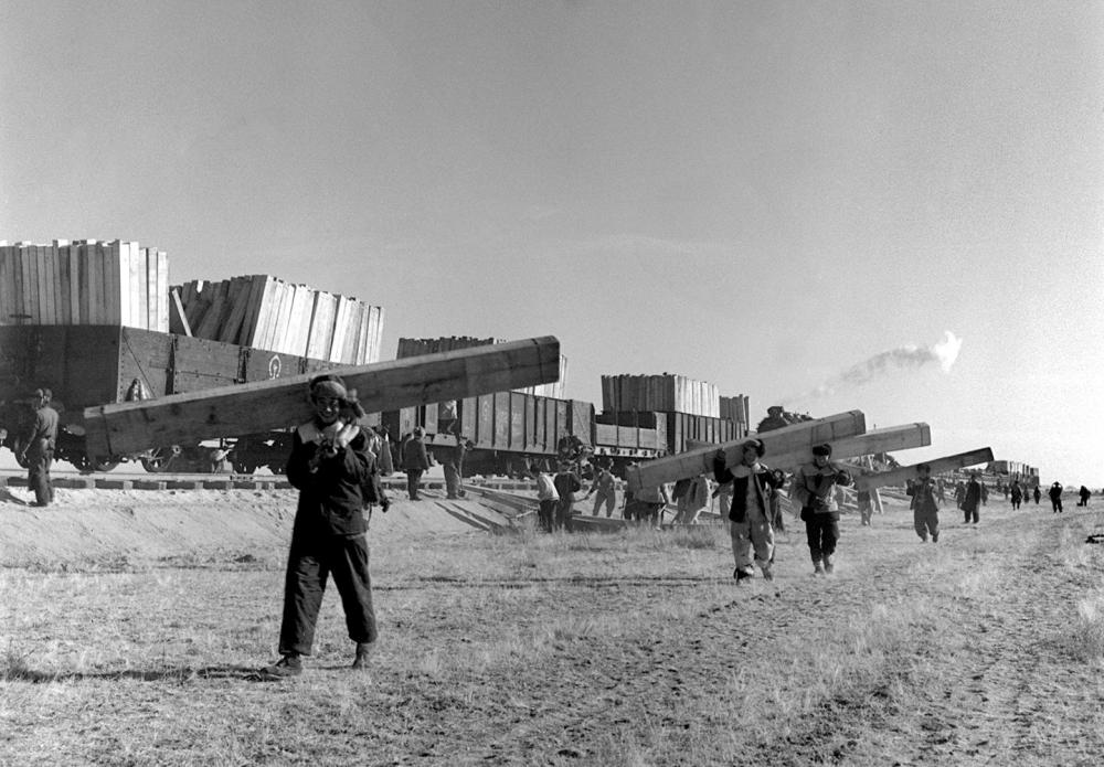 在內(nèi)蒙古集二線鐵路建設(shè)中,工人扛著枕木,前往鋪軌地點。集二線鐵路1953年5月開工建設(shè)。新華社記者 鄒健東 攝