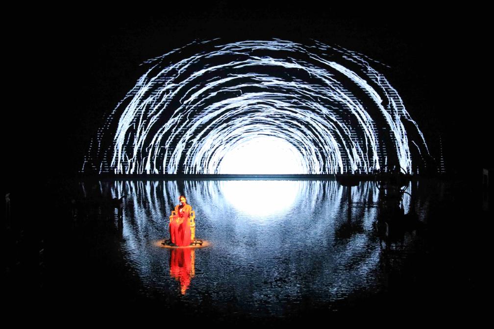 36扇高大的雕花木門輕啟,演員曼妙起舞;舞臺上光影變幻,不時落下層層水簾……“太震撼了!”觀眾們不約而同發(fā)出感嘆。