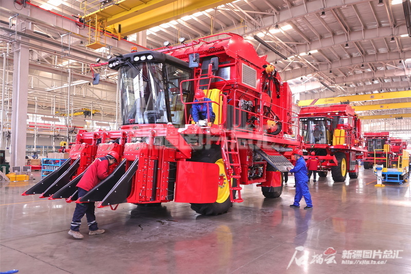 2024年3月12日,工人在位于五家渠市的新疆天鵝現(xiàn)代農(nóng)業(yè)機械裝備有限公司采棉機生產(chǎn)線上生產(chǎn)采棉機。李華北攝
