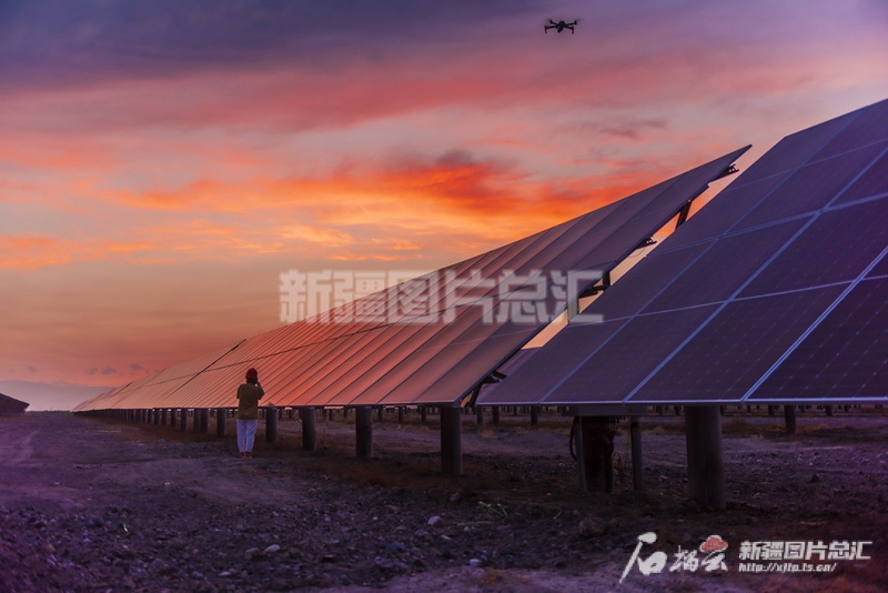 2024年8月20日,新疆生產(chǎn)建設兵團第七師124團10萬千瓦光伏發(fā)電項目建設現(xiàn)場,工人在檢查光伏板。田國建攝