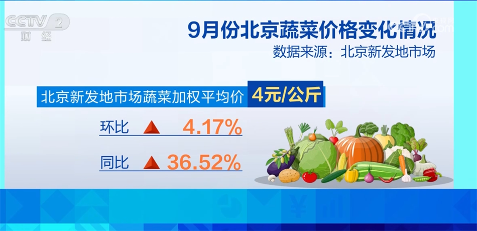 不僅西紅柿,豆角、芹菜、西蘭花等蔬菜也由于產(chǎn)地降雨造成了種植期推遲、上市期延后,近期供應(yīng)偏緊,價格上漲明顯,像目前芹菜的價格為每斤3元,比去年同期每斤上漲了2元。整個9月份,北京新發(fā)地市場蔬菜的加權(quán)平均價為每公斤4元,比8月份上漲4.17%,比去年同期上漲36.52%。