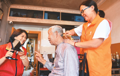 河南省洛陽(yáng)市澗西區(qū)積極構(gòu)建“嵌入式”養(yǎng)老服務(wù)體系,為老年人提供養(yǎng)老助餐、社區(qū)娛樂(lè)、健康管理、上門(mén)保潔等綜合養(yǎng)老服務(wù)項(xiàng)目,讓老人在家門(mén)口享受全方位養(yǎng)老。圖為澗西區(qū)武漢路街道秦嶺路社區(qū),養(yǎng)老服務(wù)中心護(hù)理員和社區(qū)志愿者為居家老人理發(fā)。黃政偉攝(人民視覺(jué))