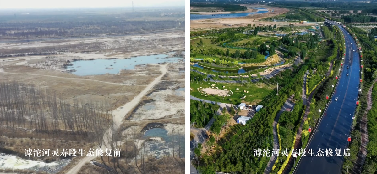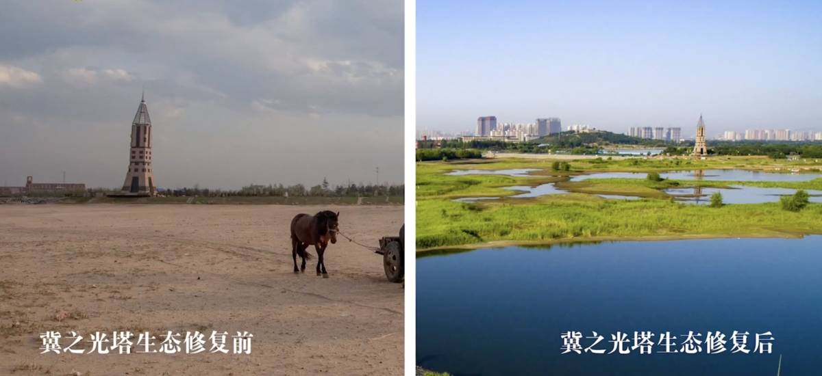 滹沱河塔之光生態(tài)修復(fù)前后對比圖。(石家莊市水利局 供圖 )