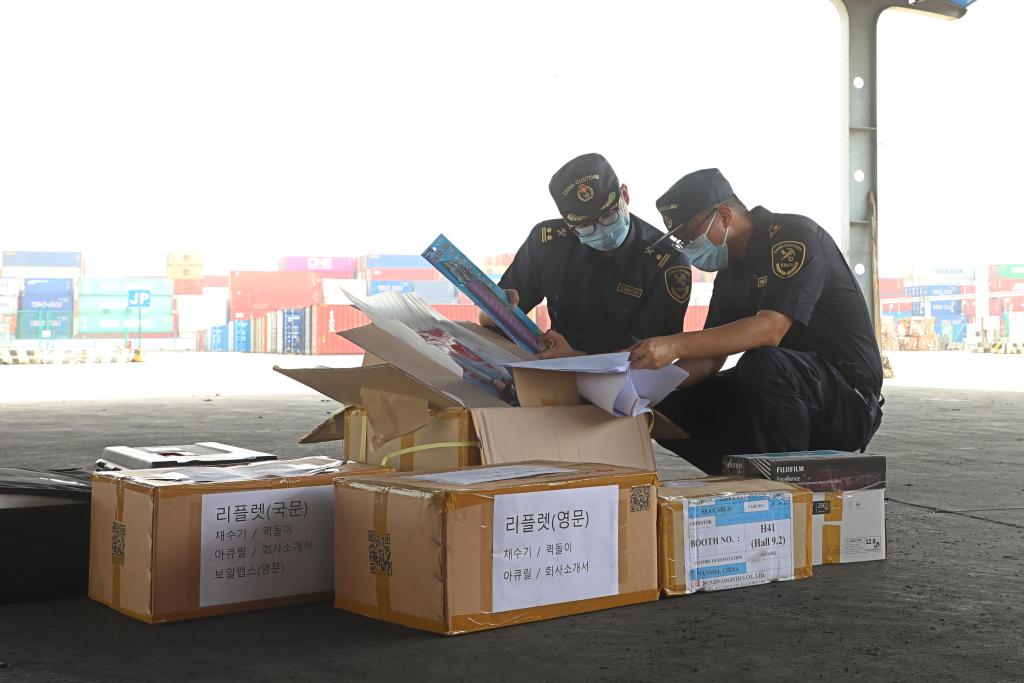 廣州海關(guān)所屬南沙海關(guān)關(guān)員對第136屆廣交會進(jìn)口展品進(jìn)行監(jiān)管。(麥東豪攝)
