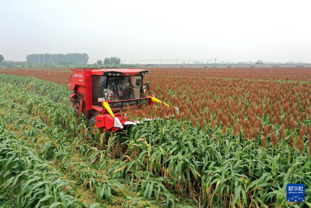 10月7日,在河北省邢臺(tái)市南和區(qū)和陽鎮(zhèn)東關(guān)村,農(nóng)民駕駛收割機(jī)收獲高粱(無人機(jī)照片)。新華社記者 王曉 攝