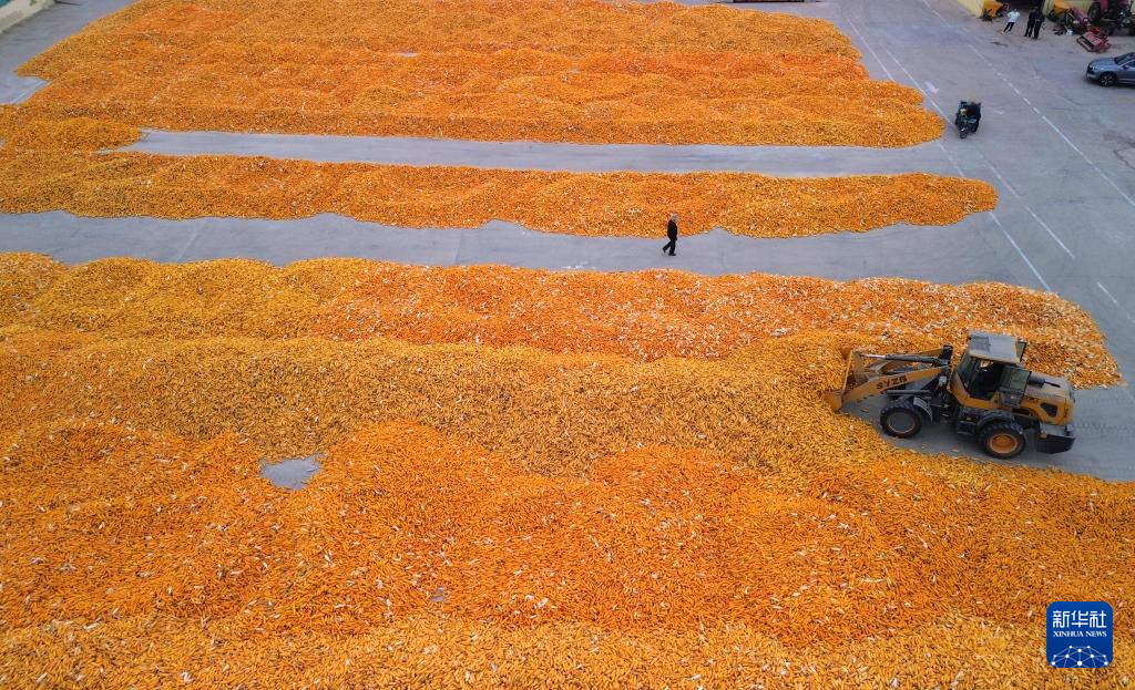 10月9日,在山東省臨邑縣德平鎮(zhèn),農(nóng)戶在晾曬剛收獲的玉米(無人機(jī)照片)。新華社記者 徐速繪 攝