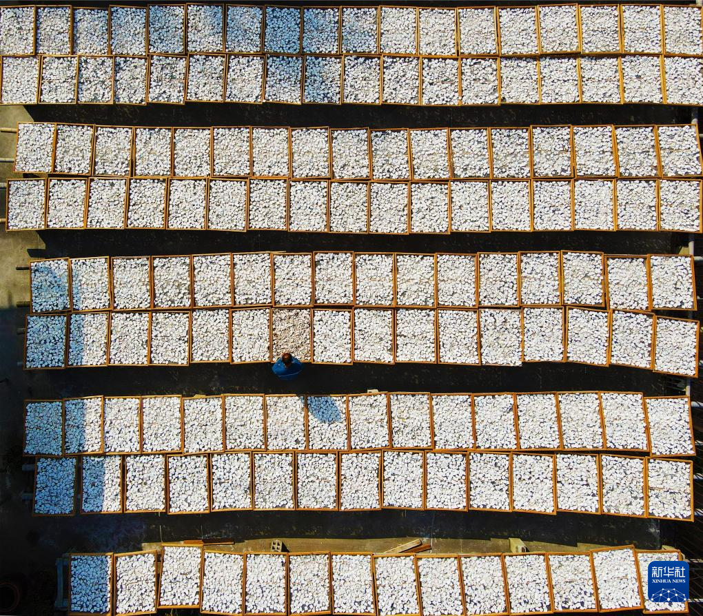 10月4日,在安徽省安慶市岳西縣響腸鎮(zhèn)千佛塔村,村民在曬茯苓(無人機(jī)照片)。新華社發(fā)(吳均奇攝)