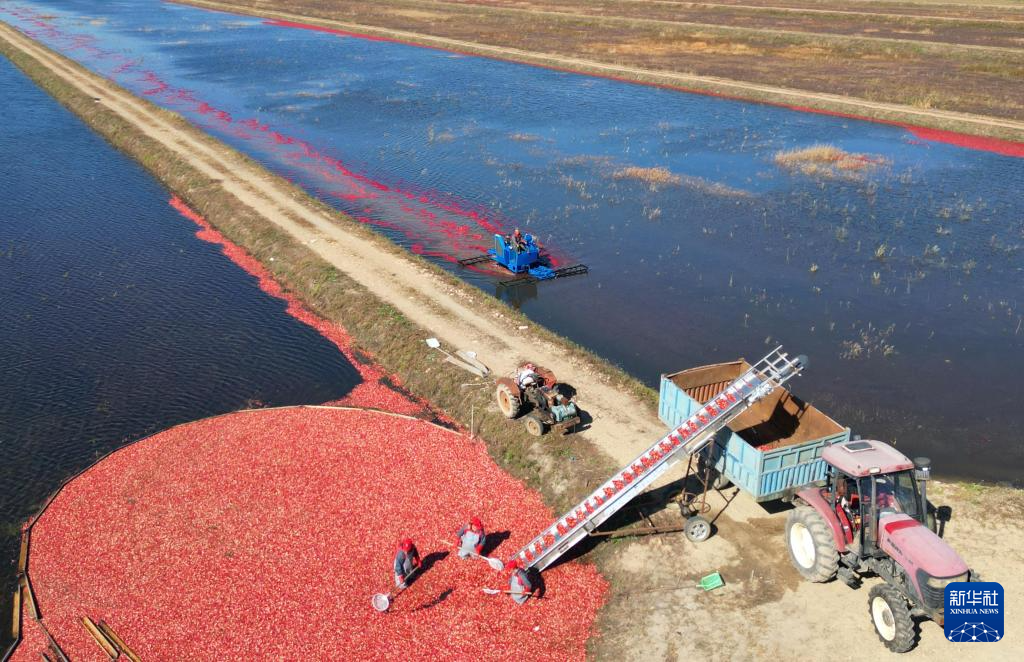 10月4日,在黑龍江省撫遠(yuǎn)市蔓越莓種植基地,工人在水中采收蔓越莓(無人機(jī)照片)。新華社發(fā)(李擁軍攝)