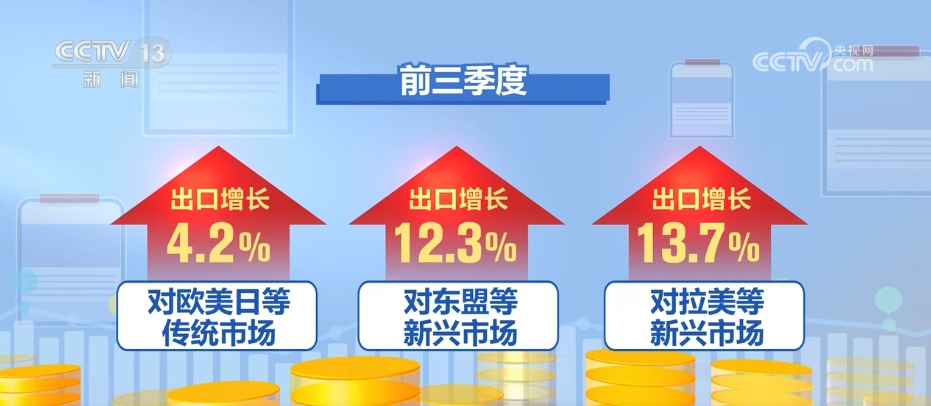 需求方面,從國際看,最新的世貿(mào)組織報(bào)告上調(diào)了對全年貨物貿(mào)易量增速的預(yù)測,世界銀行、經(jīng)合組織等機(jī)構(gòu)認(rèn)為全球經(jīng)濟(jì)正在企穩(wěn),外需回暖為我國出口創(chuàng)造了有利條件。前三季度,我國對歐美日等傳統(tǒng)市場出口增長了4.2%,對東盟、拉美等新興市場出口分別增長了12.3%、13.7%。